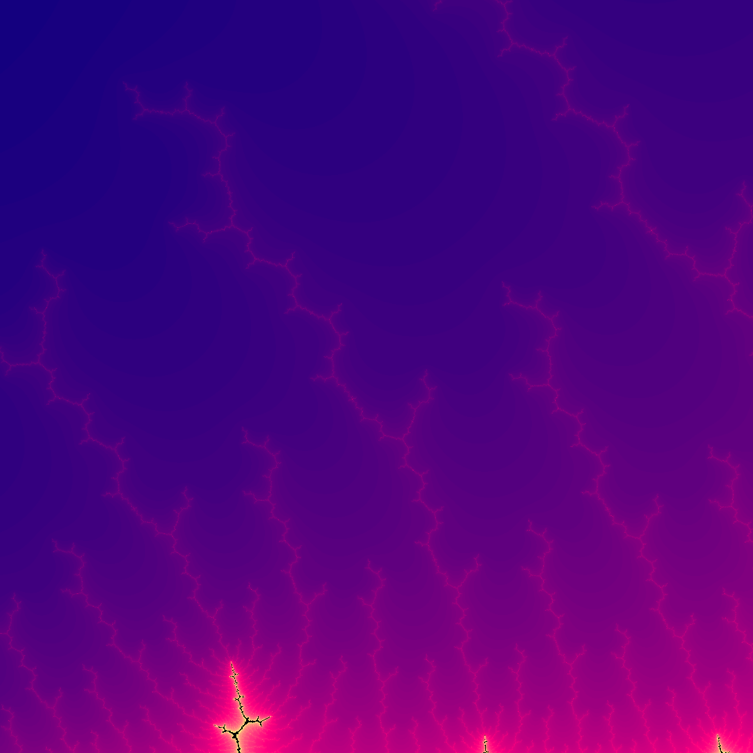 各分割部分の各ピクセルの計算回数の最大値と最小値の差をとり、最も差が大きい分割部分を選択して拡大します。この方法だと、マンデルブロ集合の先端部分(次の図に示した部分)が主に選択されて拡大されます。